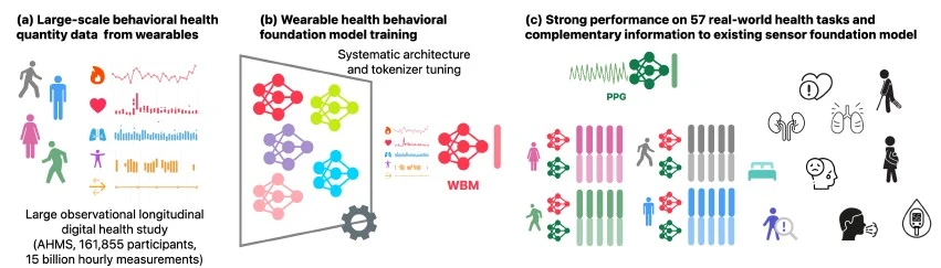 Pesquisadores da Apple, em 30 junho de 2025, divulgaram um estudo, cujo objetivo foi desenvolver um modelo fundacional, chamado Wearable Behavior Model (WBM), a partir de dados obtidos através do Apple Watch e do Iphone, para melhorar as previsões de saúde. Para isso, coletaram dados de 161.855 participantes únicos voluntários, que forneceram 2.5 bilhões de horas de dados.
