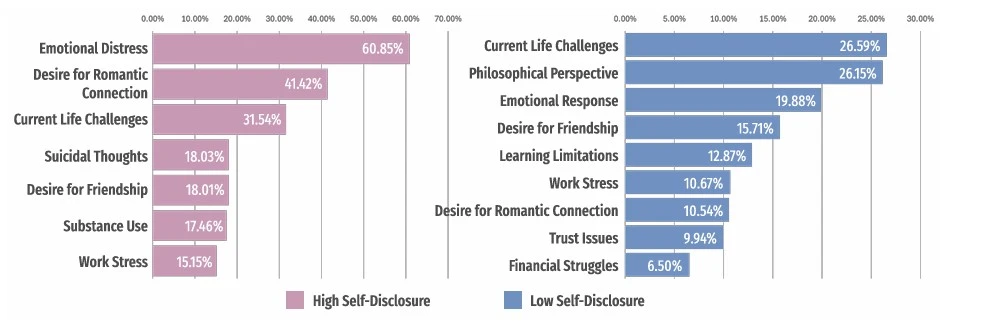 Os temas mais comuns discutidos destes participantes com os chatbots foram separados em dois grupos: rosa (auto-revelação elevada), e azul (auto-revelação baixa). E demonstrou que angústia emocional, desejo de conexão romântica e desafios de vidas atuais são temas bem comuns entre os conteúdos mais emocionais e sensíveis. Pensamentos suicidas e uso de substância também foram temas que apareceram. Já no grupo de conteúdos mais superficiais ou reflexivos, destacaram-se desafios de vidas atuais e perspectiva filosófica.