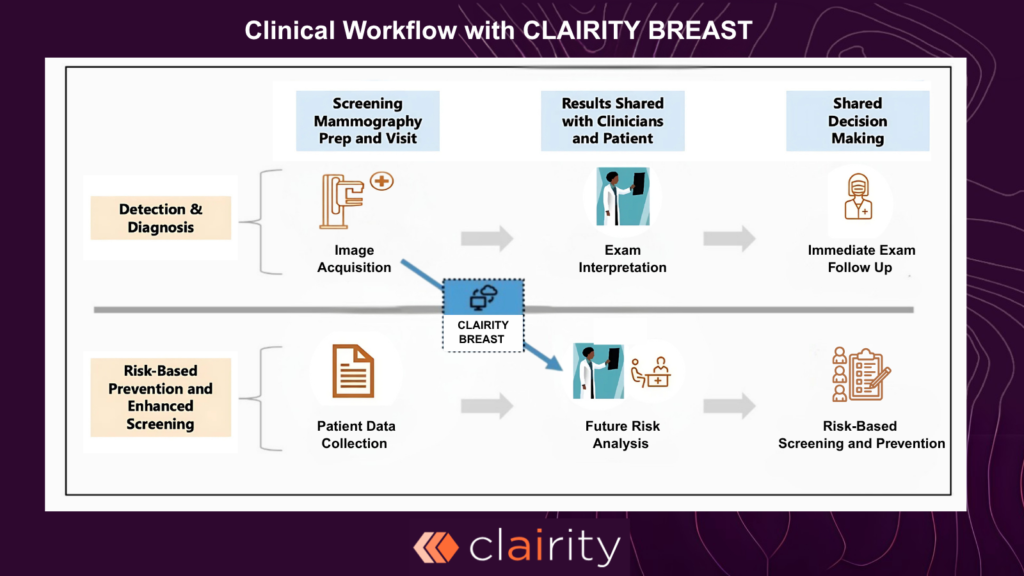 O Clairity Breast é uma plataforma de inteligência artificial que analisa mamografias digitais em termos de padrões sutis, pequenas variações na textura, densidade ou organização do tecido, não visíveis a olho nu, e em termos de pixel-level, avaliando cada pixel individualmente. A IA foi treinada em milhões de imagens e validada com dados de seguimento, ou seja, dados coletados durante o acompanhamento dos casos, de 77.000 mamografias de cinco centros clínicos diversos.